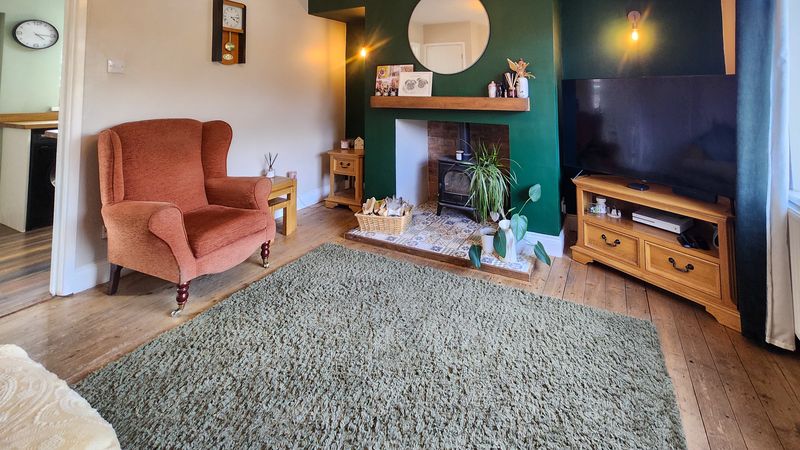 This beautifully presented two-bedroom semi-detached house offers a harmonious blend of contemporary style and classic charm. The property features a spacious reception room enhanced by a wood burning stove set within a striking feature fireplace, complemented by elegant hardwood flooring and exposed brick accents. The modern kitchen is appointed with sleek cabinetry, integrated appliances, wooden countertops, and a stylish butler sink, all bathed in natural light from generous windows. Both bedrooms provide comfortable retreats, with one boasting built-in storage and wood flooring, and the other highlighted by a vibrant feature wall and a modern bathroom. The main bathroom is finished to a high standard, featuring a walk-in shower, decorative patterned floor tiles, heated towel rail, and a relaxing bath-tub.