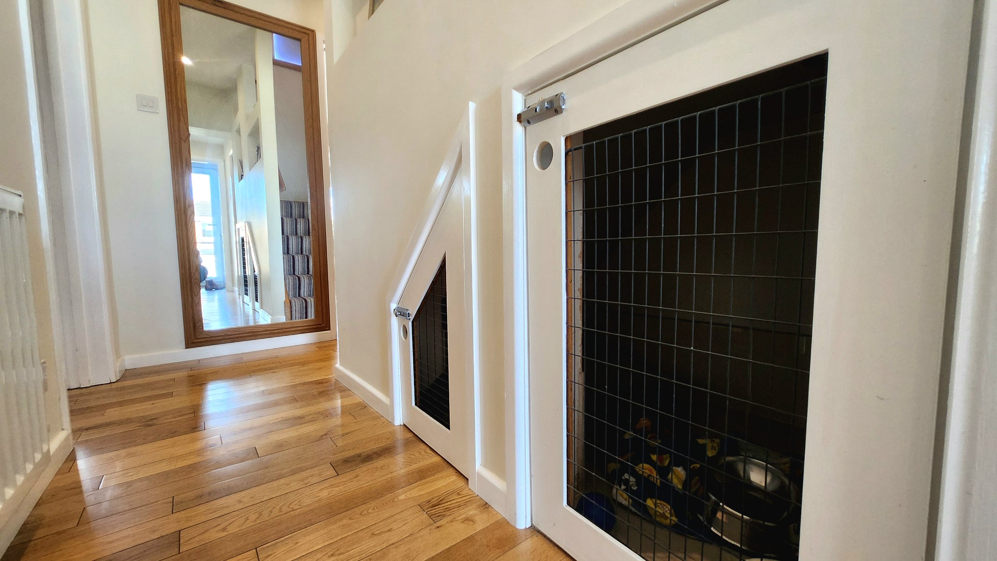 Unique Touches: Bespoke dog house built under the stairs for your furry family members.
