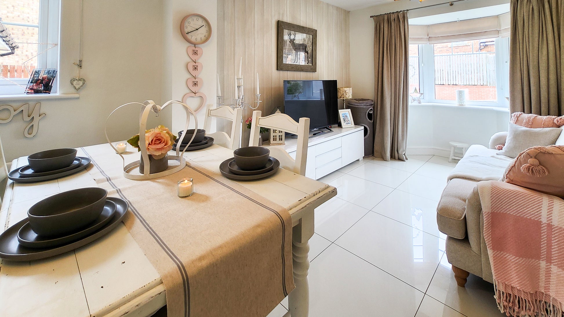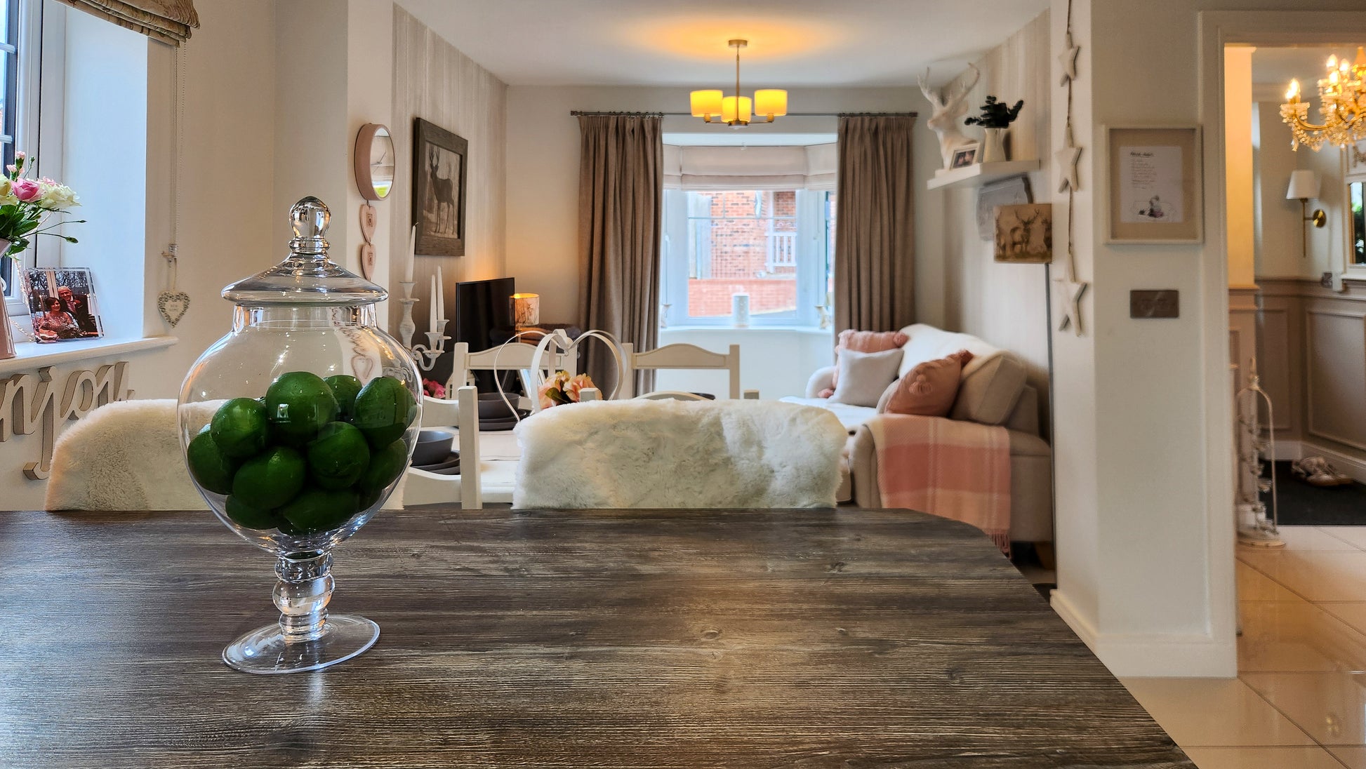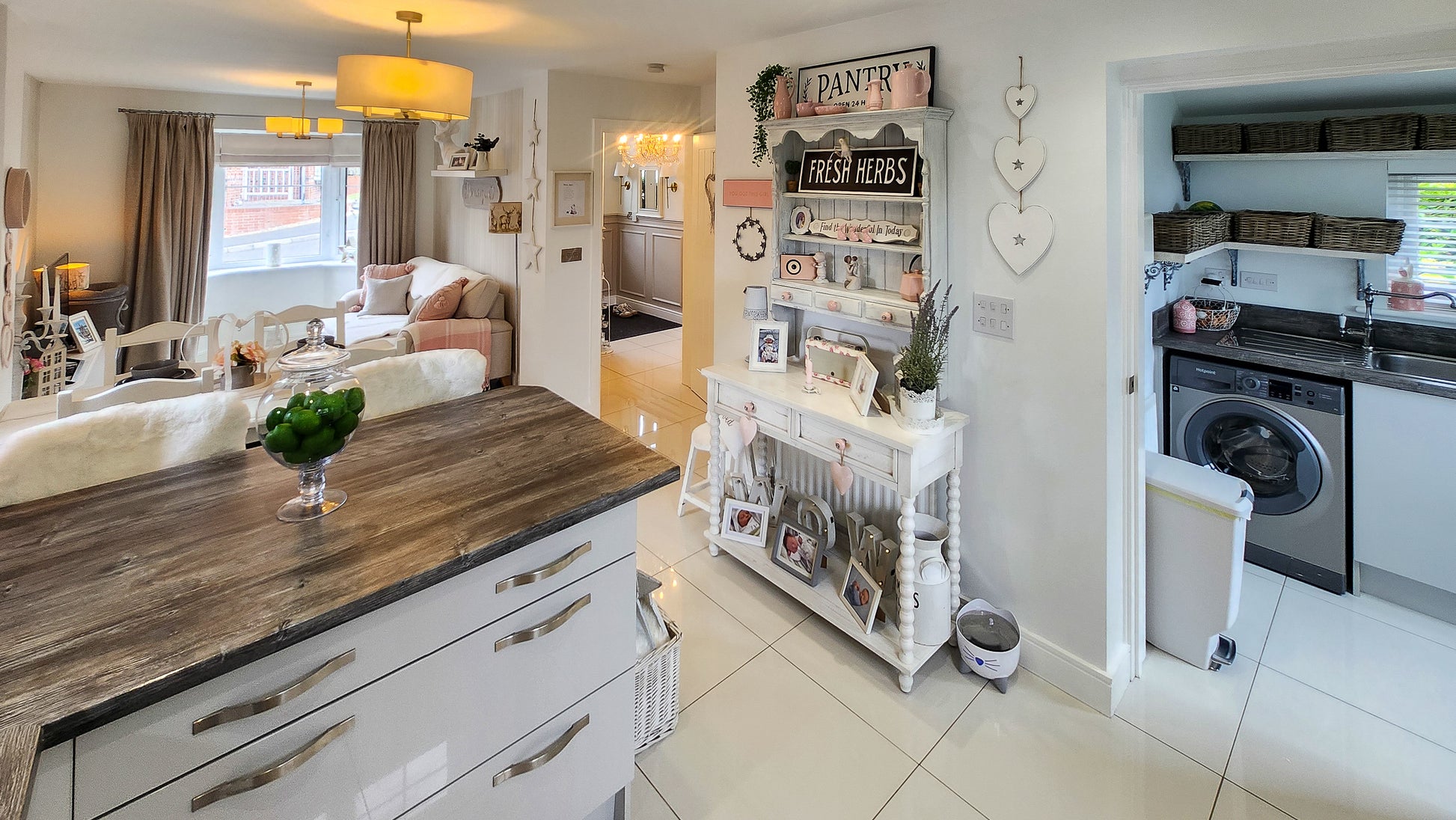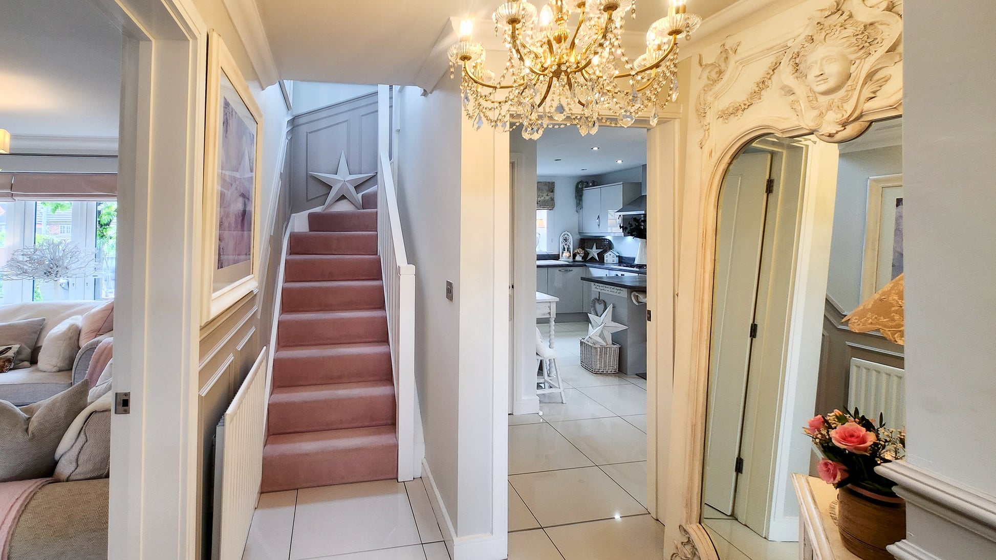 As you walk up the private drive, past the manicured front garden and into the elegant grey composite front door, youโre welcomed into a bright and airy hallway. The baby pink stair carpet adds a playful splash of colour to the high-gloss tiled floor, giving a crisp and fresh feeling from the moment you arrive.