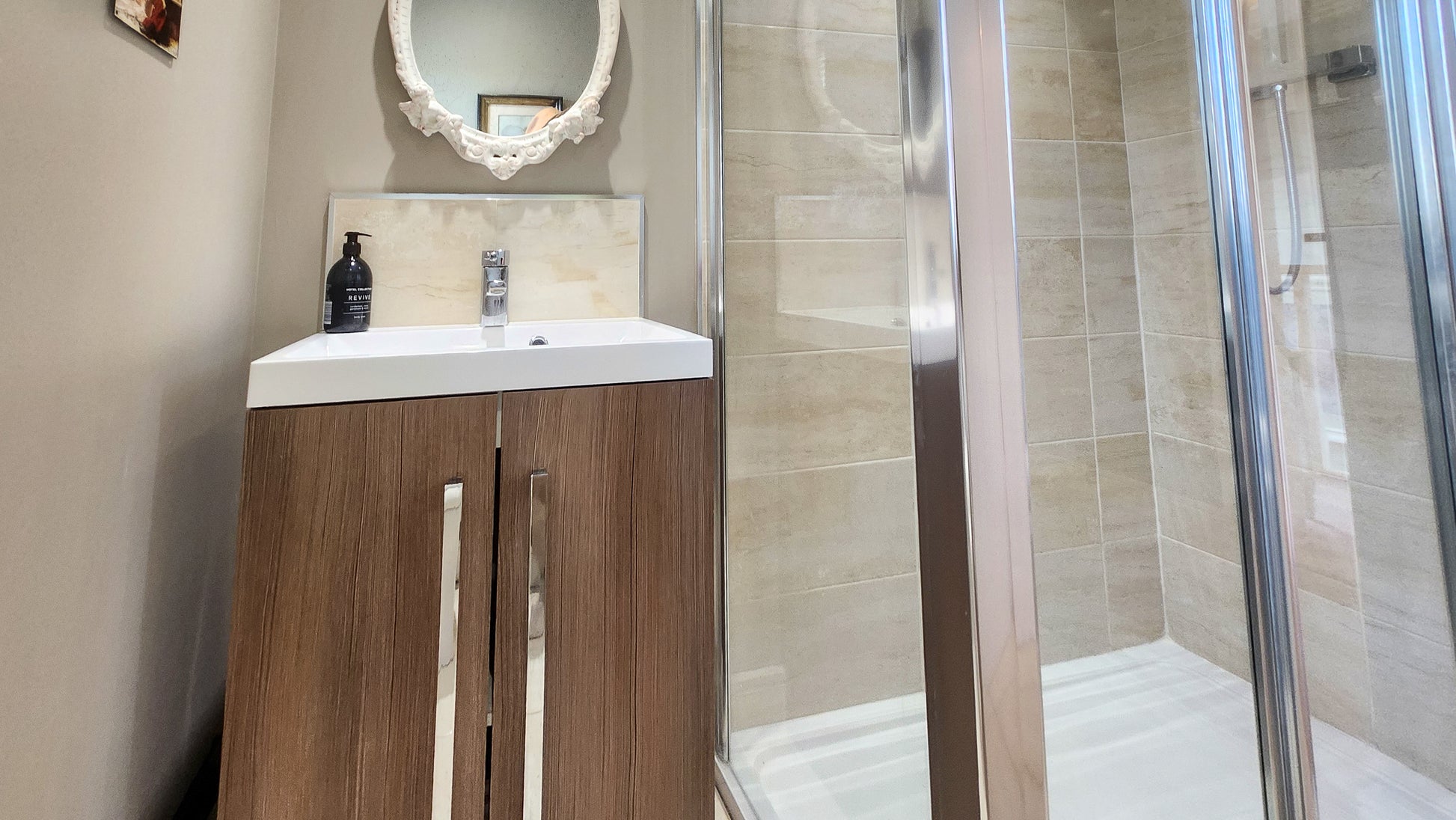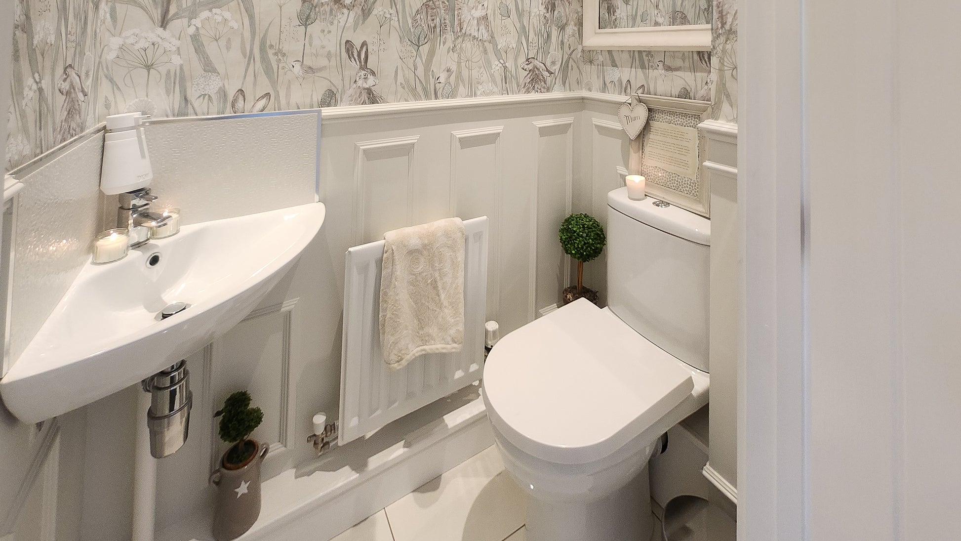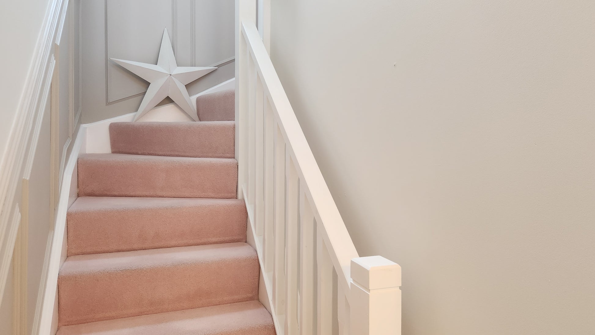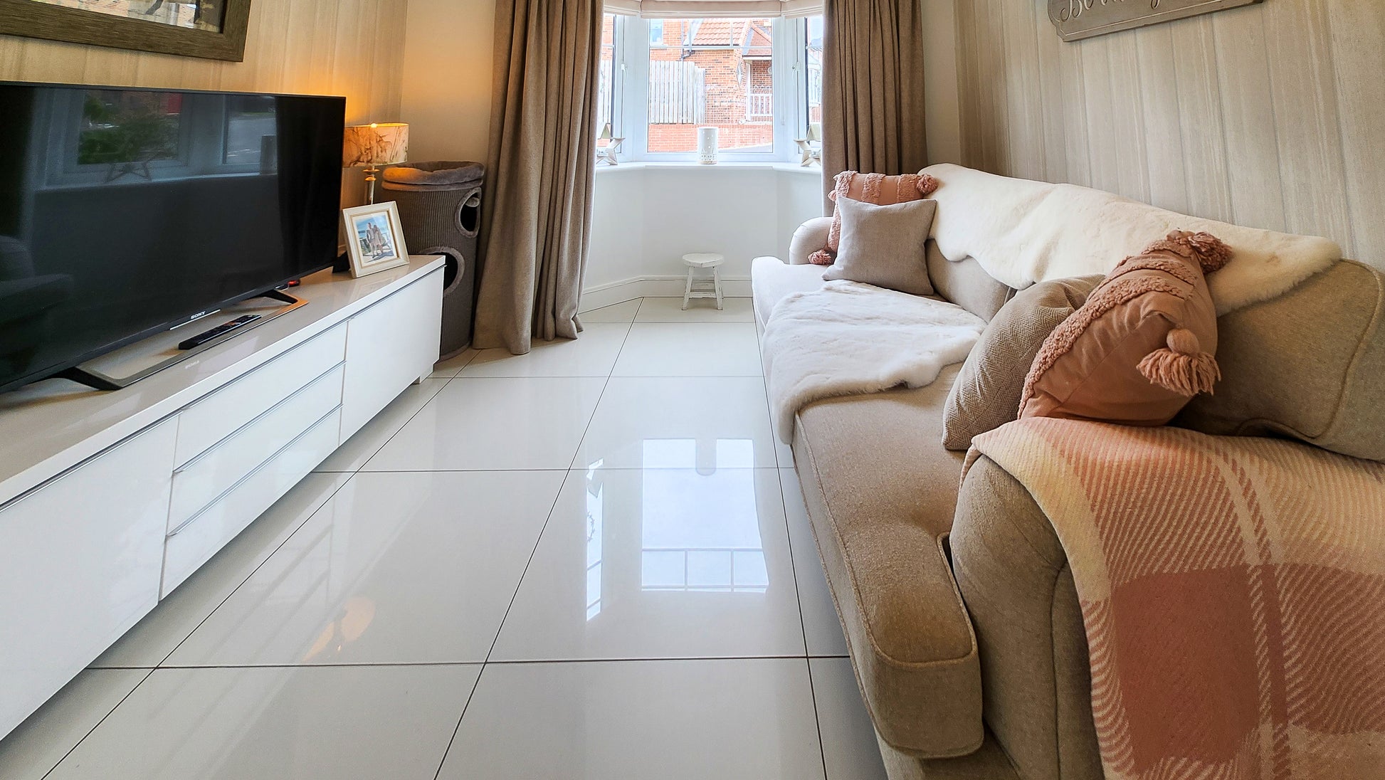As you walk up the private drive, past the manicured front garden and into the elegant grey composite front door, youโre welcomed into a bright and airy hallway. The baby pink stair carpet adds a playful splash of colour to the high-gloss tiled floor, giving a crisp and fresh feeling from the moment you arrive.
