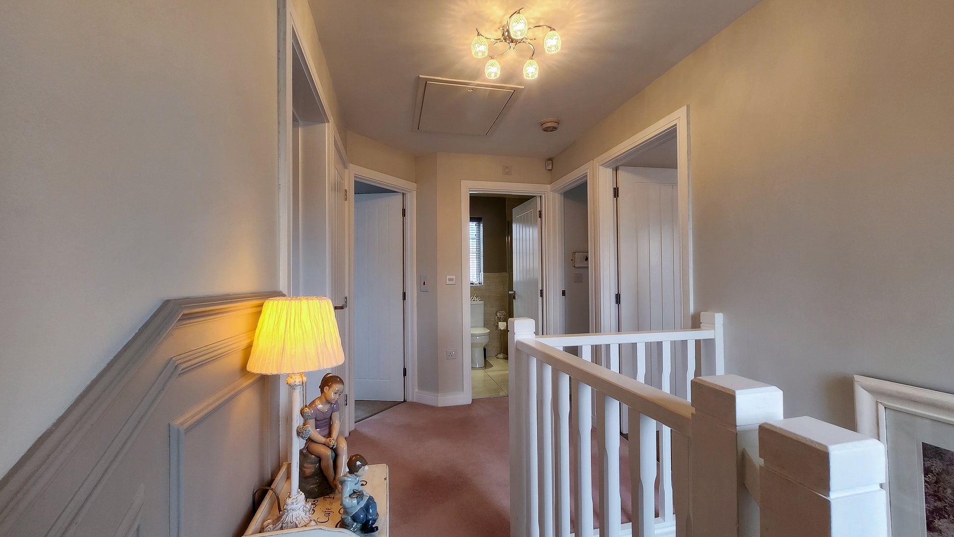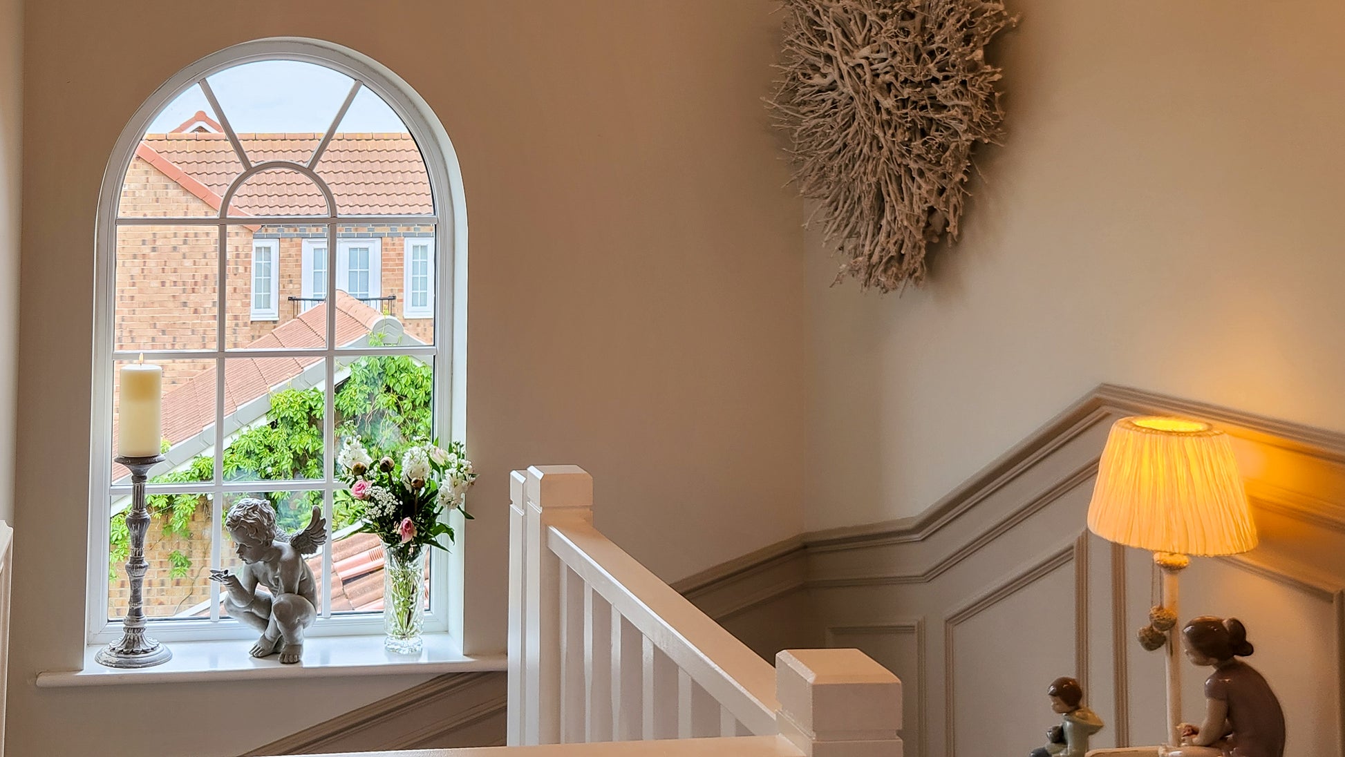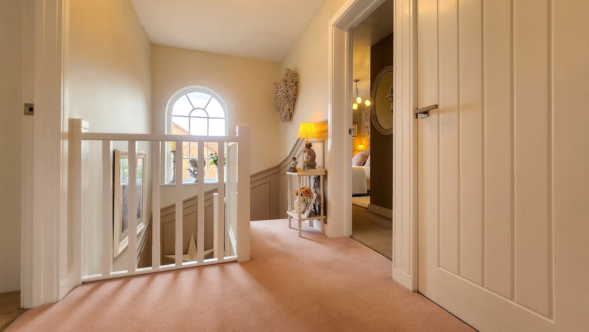 One of the homeโs most elegant features is the arched window on the landing, flooding the space with natural light and a touch of architectural elegance.