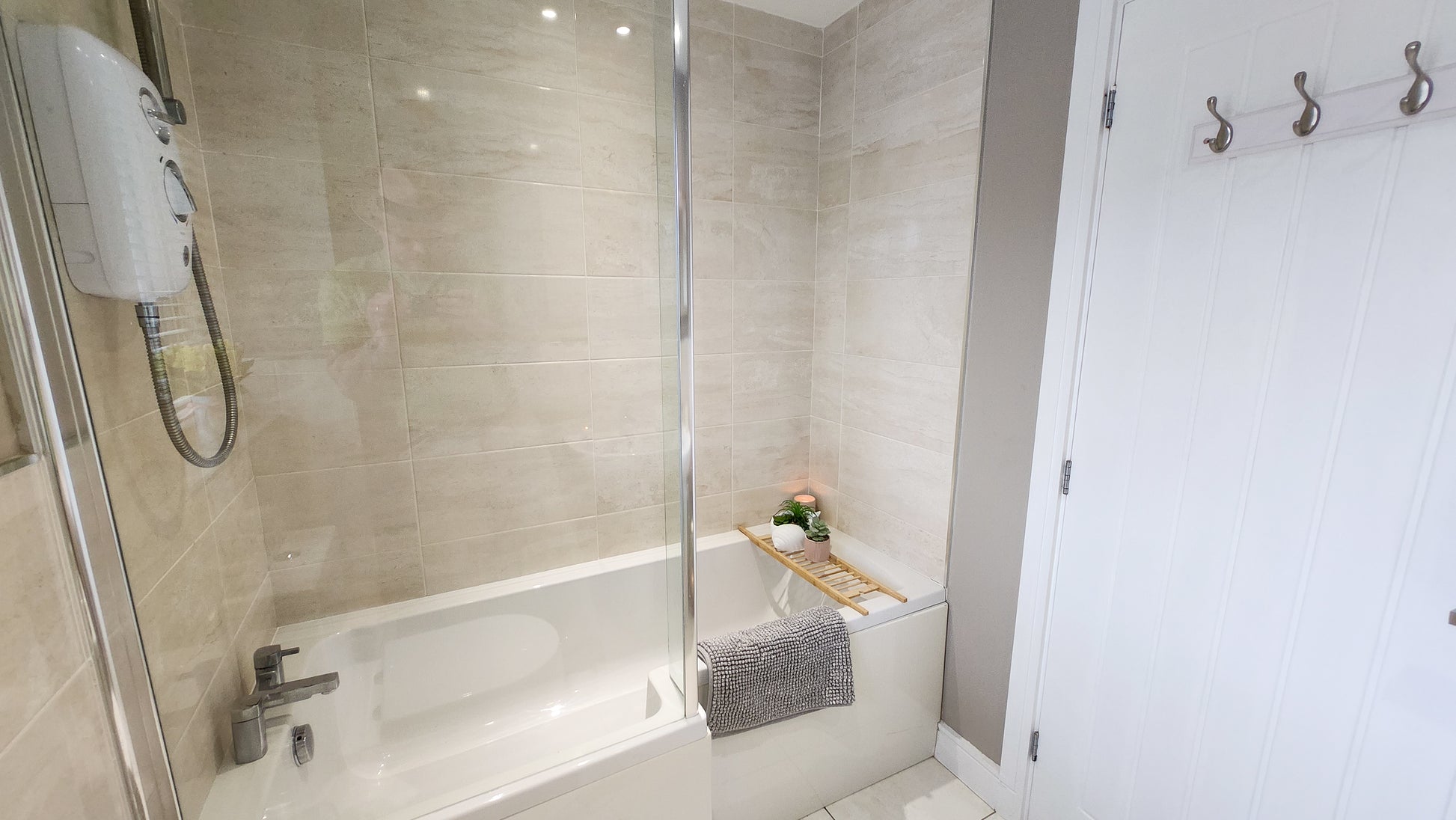 The family bathroom is a relaxing haven with a full bathtub, overhead shower, and stylish tiling.