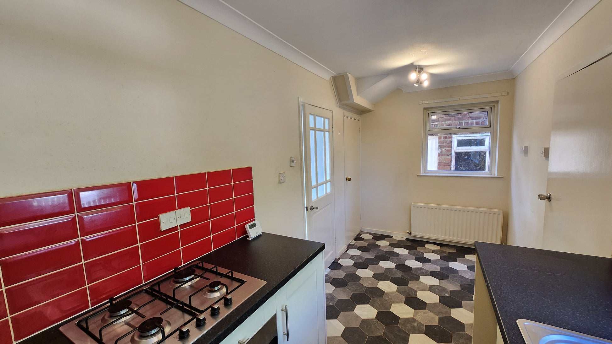 - Well-Equipped Kitchen: The kitchen features red tiling, white shaker-style cabinets, a stainless steel sink, and an integrated oven and hob. There's ample room for a dining table, creating the perfect hub for meals and gatherings.